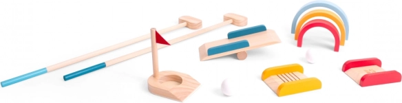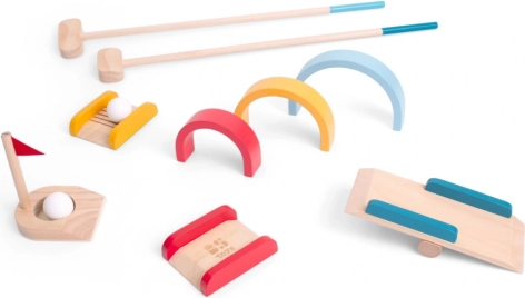 Oplev minigolfens magi i børnestørrelse. Dette kvalitets træsæt tilbyder et letforståeligt spil for 1–4 spillere fra 4 år. Takket være nem samling og farverige forhindringer får børn aktiv sjov både ude og inde og styrker naturligt finmotorik og reaktionsevne.