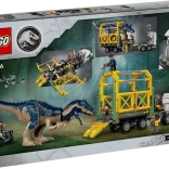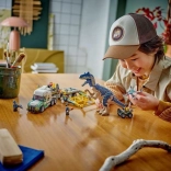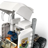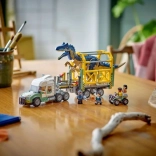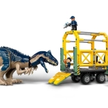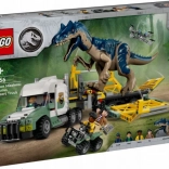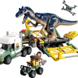 Genskab en scene fra JURASSIC WORLD: den mægtige allosaurus med bevægelige lemmer, hoved og åbnende kæber transporteres i et detaljeret bur på en trailer. Lastbilens førerhus har plads til tre minifigurer, og der er læsserampe, åbnende tag og motorhjelm samt håndtag til sikker lukning af buret. Quad og drone udvider lege mulighederne og støtter kreativ fortælling.