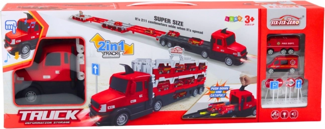 Denne multifunktionelle autotransporter giver dobbelt så meget sjov. I lastbiltilstand transporterer den biler, og når den foldes ud, skaber den en lang racerbane til spændende køreture. Lys og lyde forstærker stemningen ved både løb og redningsmissioner.