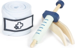 Sprøjten har et bevægeligt stempel, og bandagen lukkes med velcro. Børn får en mere realistisk leg og træner samtidig finmotorikken.