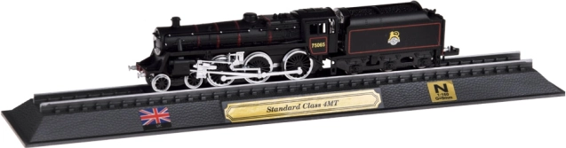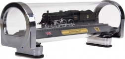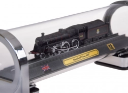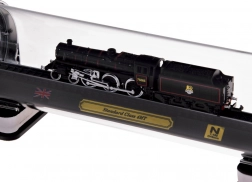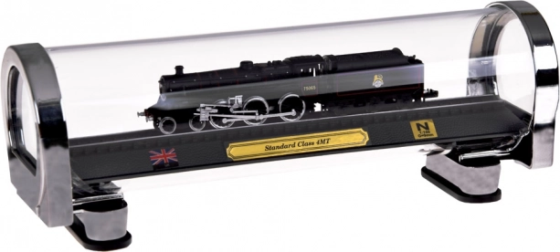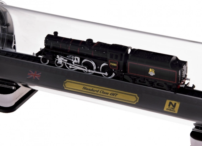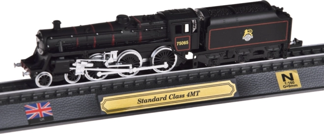 Denne detaljerede model af det britiske damplokomotiv STANDARD CLASS 4MT er et ideelt valg for jernbaneentusiaster og stilfuld dekoration. Den præcise udførelse i målestok 1:160 fremhæver autentiske detaljer, kontrastlakering og fin linjering på hjulene. Modellen er fastgjort på et stykke skinner på en elegant sokkel med plakette, britisk flag og målestoksangivelse.