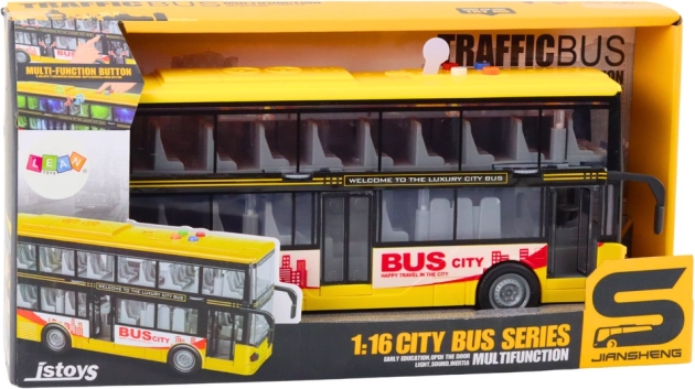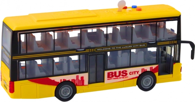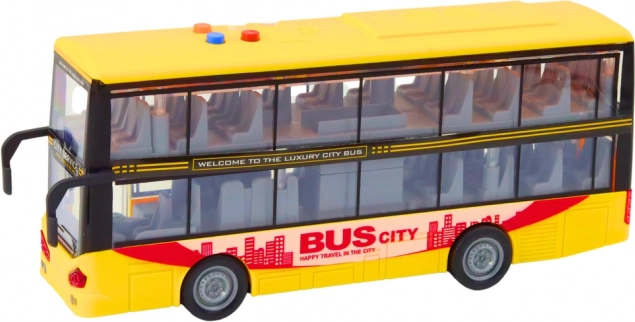 Bussen i den ikoniske gule farve efterligner troværdigt en rigtig turist-dobbeltdækker. Børn kan aktivere horn, motord lyd og se blinkende lys, hvilket øger realismen i legen. Friktionsdrevet sikrer en jævn kørsel – giv den et lille skub, så kører bussen afsted.