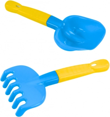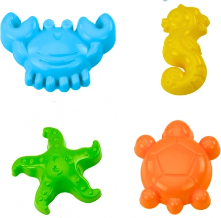 Den ergonomiske skovl og rive passer til børnehænder. Sættet med fire forme (krabbe, søstjerne, søhest, skildpadde) stimulerer fantasien.