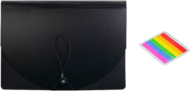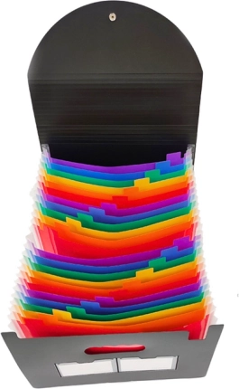 Mappen rummer op til 24 lommer til A4-dokumenter, hvor hver lomme har en forskellig farve for nem og hurtig sortering og adgang til dokumenter. Hver lomme er rummelig nok til at indeholde adskillige hundrede ark papir, hvilket gør mappen ideel til opbevaring af store mængder dokumenter. Lommerne kan mærkes med tusch, hvilket gør organiseringen lettere og hjælper med hurtigt at finde de nødvendige dokumenter. Så kan du nemt identificere indholdet af hver lomme.