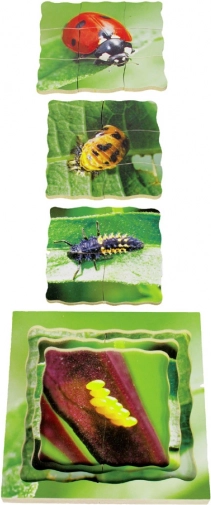 Opdag et anderledes, lærerigt puslespil, som fanger både børn og voksne. Dette lagdelte puslespil indeholder fire faser af mariehønens udviklingscyklus: æg, larve, puppe og voksen mariehøne, hvilket er en fremragende måde at lære om naturen på en legende måde.