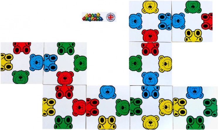 Hver brik viser bjørne i klare farver, som fanger opmærksomheden og stimulerer børns nysgerrighed.