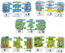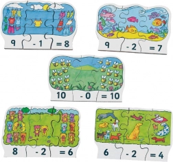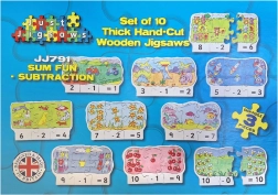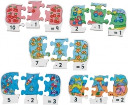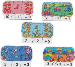 Dette attraktive og lærende sæt af træpuslespil er et ideelt redskab for børn, der vil øve subtraktion på en sjov måde. Hver brik indeholder: