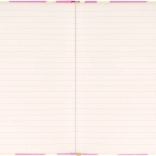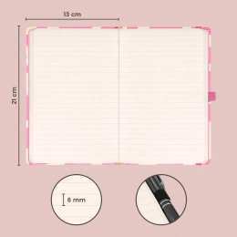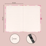 Stilfuld lyserød notesbog til hverdagsbrug med hårde omslag, elastiklukning, penneløkke og indre lomme. Den tilbyder 172 prikkede sider på gult papir i et praktisk format 13 × 21 cm til dine idéer, noter og dagbog.