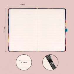 De linjerede sider på gult papir giver en behagelig kontrast og god læsbarhed. Det kompakte mål 13 × 21 cm passer perfekt i en håndtaske eller rygsæk, og rummer alligevel hele 172 sider til noter, opgaver og kreative idéer.