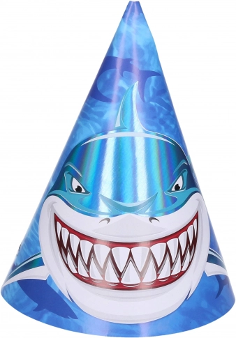 Partyhatte med haj, 15 cm, pakke med 6 stk. Stilfuld dekoration til børnefødselsdage og temafester. Nem at tage på og skaber en fantastisk hajstemning.