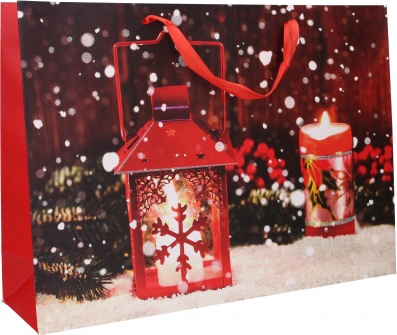 Julemotiv med lanterne, pynt og vinterelementer giver gaven et repræsentativt udseende.