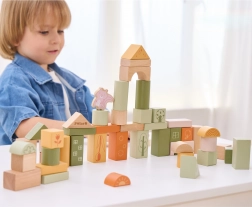 50 omhyggeligt forarbejdede træklodser i blide nuancer med dyremotiver stimulerer kreativ leg og STEM-grundlag. Den glatte overflade og høje kvalitet sikrer holdbarhed og sikker leg.