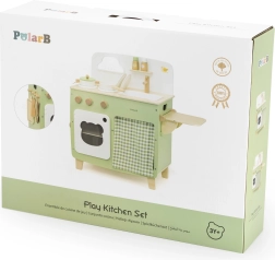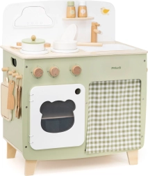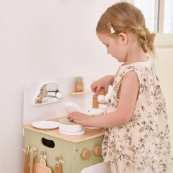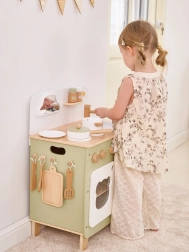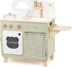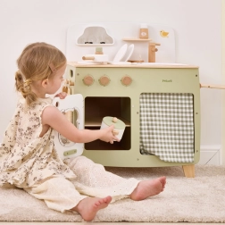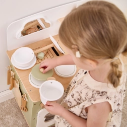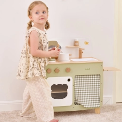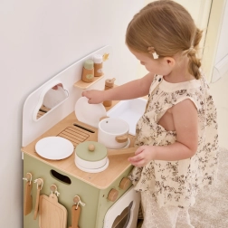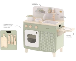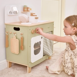 Det stilfulde legekøkken i behagelige natur- og grønne nuancer giver børn en realistisk madlavningsoplevelse. Takket være den robuste trækonstruktion, drejeknapper, vask og ovn kan små kokke nyde timevis af sikker og kreativ leg. Det praktiske klapbare sidebord udvider arbejdsfladen til skæring eller servering, mens skabet med forhæng gemmer alle skatte.