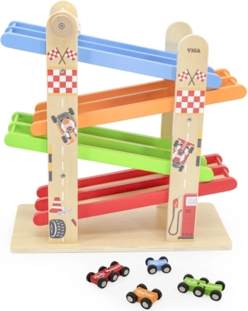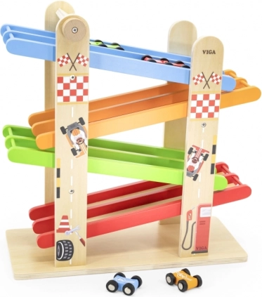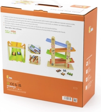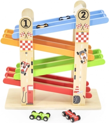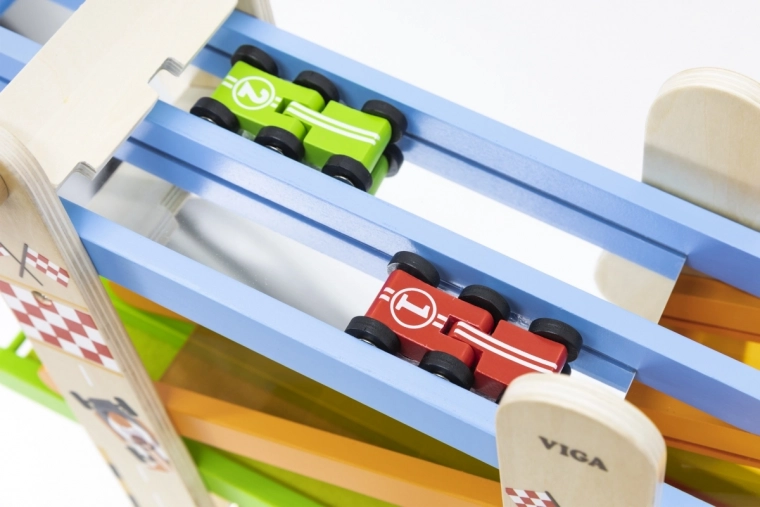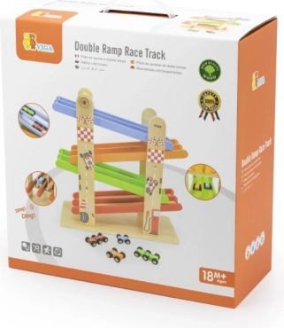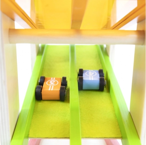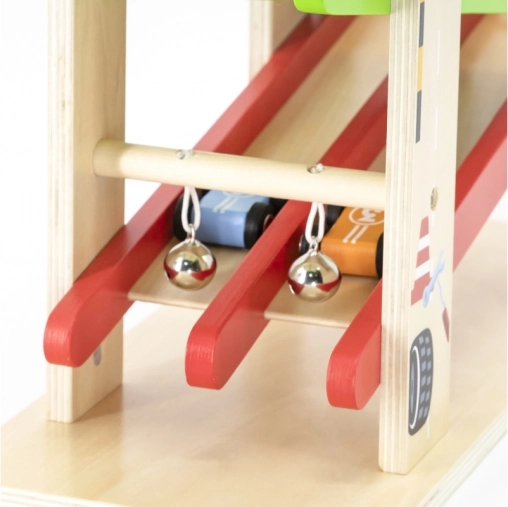 Denne robuste træbane har en dobbelt rampe til spændende løb med to biler samtidig. Børnene bliver fanget af de livlige farver og klokkerne ved målstregen, der ringer, når bilerne kommer i mål. Konstruktionen er tilpasset små børnehænder – glatte kanter, stabil base og holdbare materialer sikrer lang levetid og sikker leg.