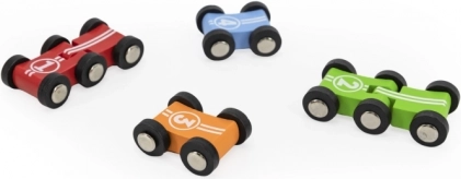I pakken finder du fire farverige legebiler med startnumre i to typer – to firehjulede og to seks-hjulede – for større variation i kørslen. Legen udvikler naturligt logisk tænkning, finmotorik, øje–hånd-koordination, læring af farver og tal samt sociale færdigheder i konkurrence (sejr/nederlag).
