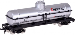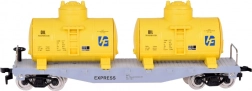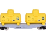Platformvogn med to gule tanke og en separat sølvfarvet tank CHEMICAL. Drejelige aksler muliggør smidige passager gennem kurver.