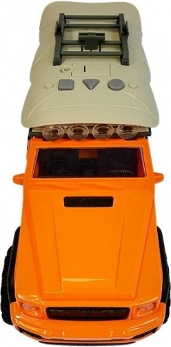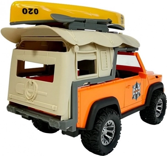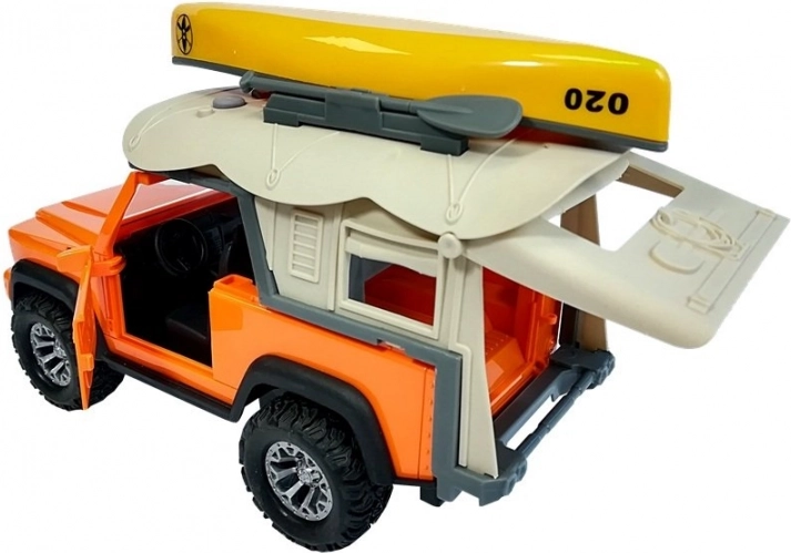 Eventyrsæt til små rejsende: robust terrængående JEEP med lys- og lydeffekter, åbning af døre og bagklap, gummidæk og tagholder til kajak med pagajer. Den ideelle legetøj til børn fra 3 år, der stimulerer fantasi og kærlighed til naturen.