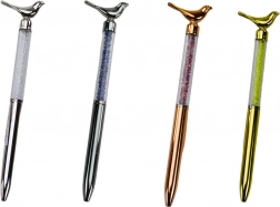 Denne stilfulde kuglepen skiller sig ud med en original afslutning formet som en lille fugl og en gennemsigtig sektion fyldt med små sten, der glitrer let, når pennen bevæges. Perfekt til skole, kontor eller som en dekorativ gave.