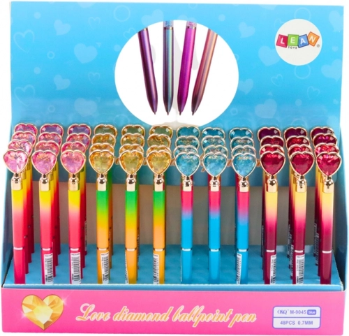 Elegant kuglepen med pynt i form af et hjerte med diamanteffekt, som kombinerer stil og behagelig skrivning. Den har blå blæk og en 0,7 mm spids for et jævnt skriveresultat – ideel til daglig brug og som en gave. Tilgængelig i et mix af farver.