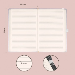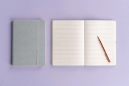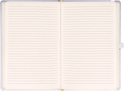Elegant linjeret notesbog i Balacron-udførelse med sølvfarvet overflade og mål på 15 × 21 cm. Det holdbare ydermateriale er ekstremt modstandsdygtigt over for skader, hvilket gør den ideel til daglig brug på arbejde, i skole og på farten.