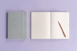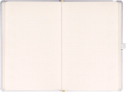 Den stilfulde Notique Balacron-notesbog udmærker sig ved et kvalitetsovertræk, som er ekstremt modstandsdygtigt over for ydre skader. Den sølvfarvede finish virker professionel og tidløs, og den prikkede sideopsætning giver fleksibilitet til skrivning, tegning og bullet journaling.