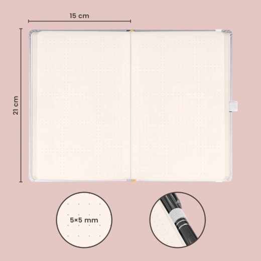 Takket være det universelle format 15 × 21 cm passer den i de fleste tasker og rygsække, så du kan have den med overalt. Den prikkede lineatur gør det nemt med overskuelig planlægning, oprettelse af tabeller og præcise noteskemaer uden forstyrrende fulde linjer.