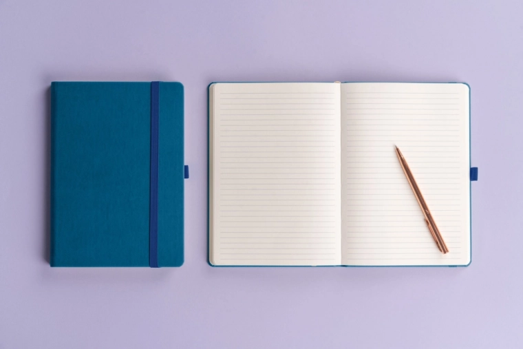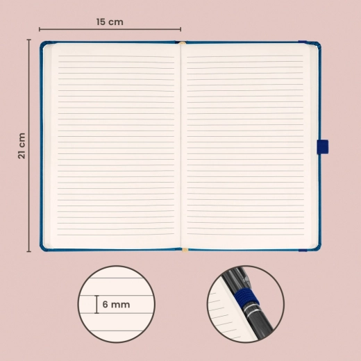 Den stilfulde Notique Aprint i blå kombinerer praktikalitet og elegance. Linjerede sider gør det nemt at holde overblik over noter, mens den let strukturerede omslagsoverflade virker professionel og egner sig til branding.
