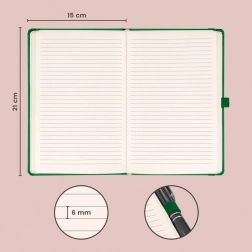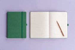 Den stilfulde Aprint-notesbog i grøn er et fremragende valg til kontoret, skolen og på farten. Den linjerede inderside gør det nemt at føre overskuelige noter, og takket være den behagelige overflade med fin struktur virker notesbogen professionel og elegant.