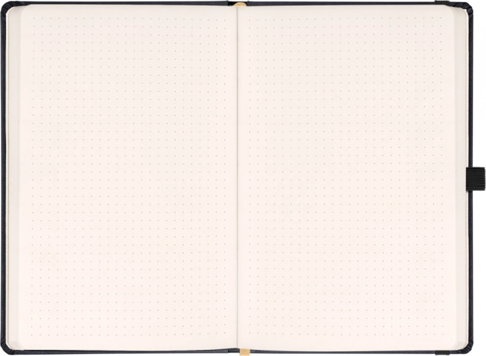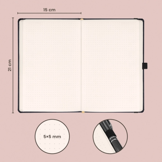 Det prikkede gitter giver fleksibilitet til skrivning, tegning og opbygning af overskuelige layouts. Overfladen egner sig desuden til logoprægning, så notesbogen let kan forvandles til en stilfuld firmagave eller præsentationsmateriale.