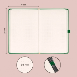 Takket være det prikkede gitter er det nemt at skrive, tegne og planlægge. Formatet 15 × 21 cm (A5) er perfekt til rejser, tasken og skrivebordet.