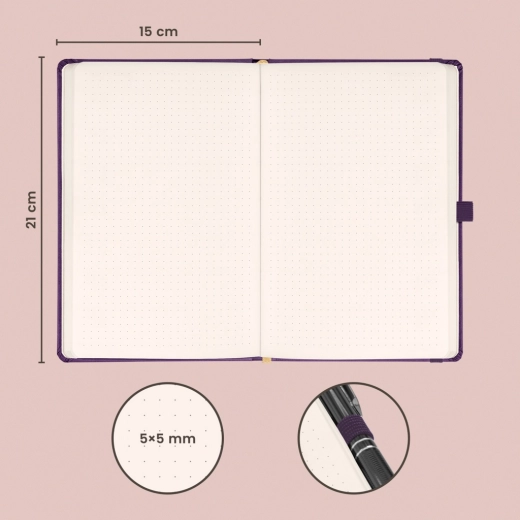 Leder du efter en repræsentativ og funktionel notesbog til arbejde og fritid? Den punktede NOTIQUE Aprint Neo i lilla tilbyder et universelt layout med prikker, som gør det lettere at skrive overskueligt, tegne grafer og føre bullet journal. Den let strukturerede overflade virker elegant og er ideel til prægning af logo eller personliggørelse.