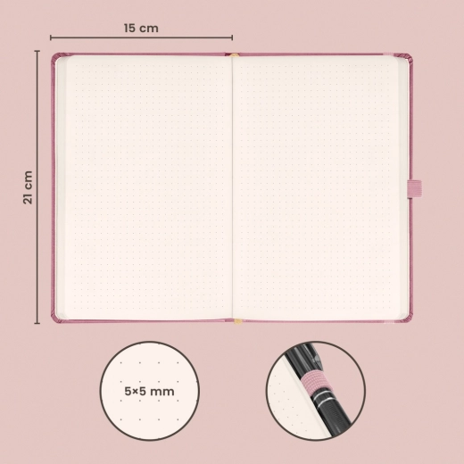 Stilfuld prikprikket notesbog Notique Aprint Neo i lyserød er ideel til noter, skitser og bullet journal. Den tilbyder en elegant overflade med fin struktur, som let kan præges med firmalogo, samt et praktisk format 15 × 21 cm til daglig brug.