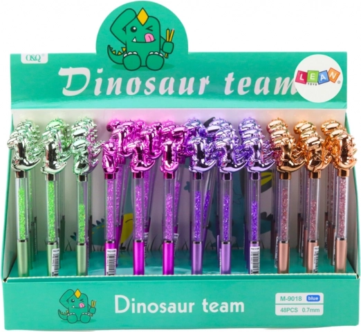 Elegant kuglepen med en dinosaur-figur og gennemsigtig krop fyldt med glitrende sten, som giver stil, behagelig skriveoplevelse og unikt design. Med en fin spids på 0,7 mm og blå blæk er den ideel til daglig brug eller som en original gave.
