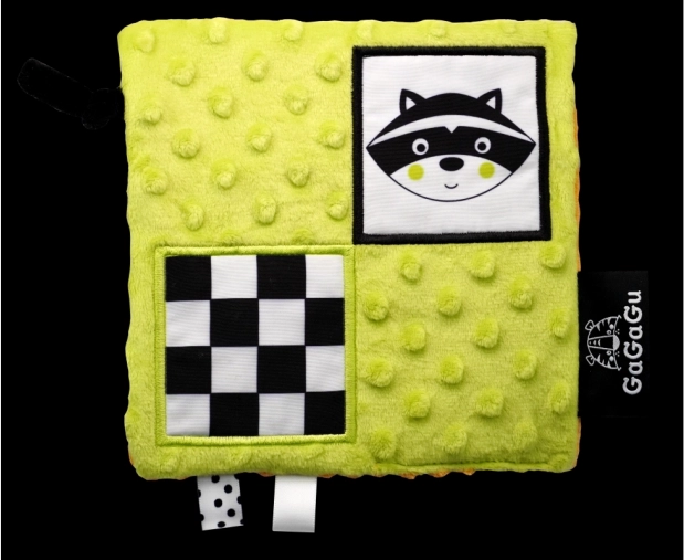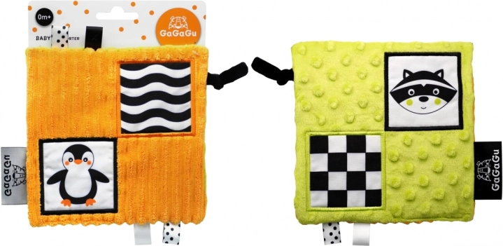 Det dobbeltsidede design byder på to attraktive illustrationer – pingvin og vaskebjørn – og masser af detaljer at udforske: bånd, plysstropper og en større label for lettere greb. Disse elementer understøtter hånd-øje-koordination og træning af finmotorikken.