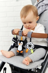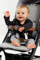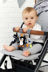 Legetøjet kan nemt fastgøres på forskellige overflader som barnevogne, tremmesenge eller autostole, hvilket gør det til en perfekt ledsager både på farten og derhjemme.