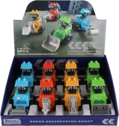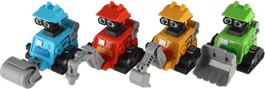 Robotterne er lavet af holdbar plast og kommer i fire attraktive varianter inspireret af byggemaskiner. De kompakte mål 8 × 10 × 14 cm passer i børnehånden og stimulerer fantasien samt udvikler finmotorikken.