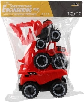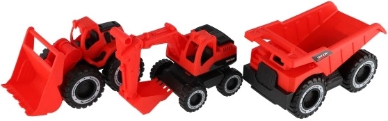 Oplev et sjovt sæt med tre plastik-byggelastbiler i størrelsen 15–19 cm med friløb. Ideelt til leg derhjemme og i sandkassen – sættet indeholder en læssemaskine, en tipvogn og en minigraver med bevægelige dele for realistisk byggeleg. Et godt valg til at udvikle fantasi og finmotorik hos børn fra 3 år.
