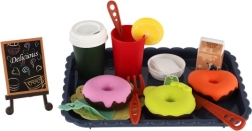 Farverige donuts, småkager, drikkevarer og kopper samlet på én bakke – børn kan straks begynde at servere for familie og venner.