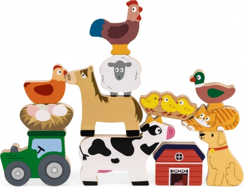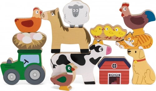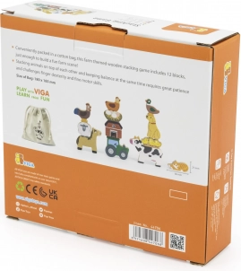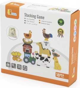 Dette træsæt indeholder 12 dele med gårdtema. At stable dyrene oven på hinanden og samtidig holde balancen kræver stor tålmodighed, fingerfærdighed og finmotorik. Delene er pakket i en stofpose. Pakningsmål ca. 16×15×4 cm. Posens mål 18×18,5 cm. Alder 18 m+
