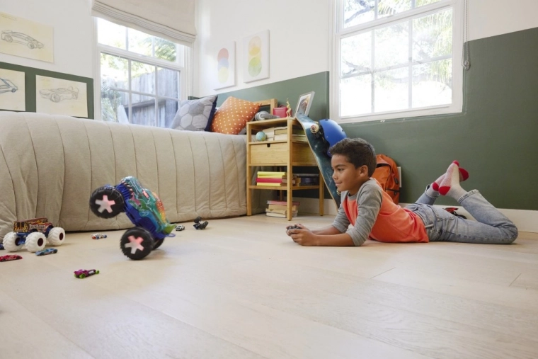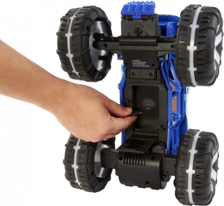 Ved at trykke og holde handlingsknappen nede stiller bilen sig op på to hjul og udfører et trick! Farver og dekorationer kan variere mellem modellerne, men hver af dem garanterer timevis af dynamisk sjov.