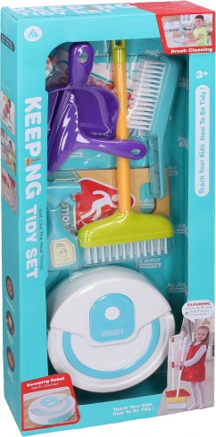 Sjovt rengøringssæt til børn: robotstøvsuger, kost, skovl, sprayflaske og klistermærker.