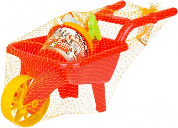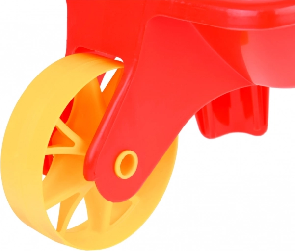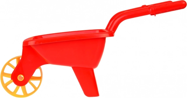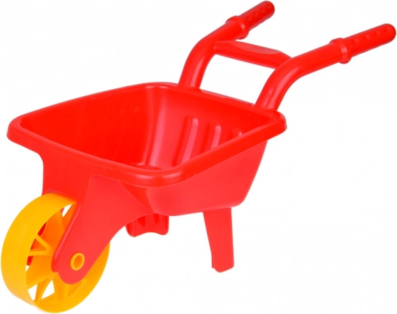 Plasttrillebør med et bredt hjul og behagelige håndtag gør det nemt at transportere sand, jord eller legetøj. Børn træner balance og koordination.