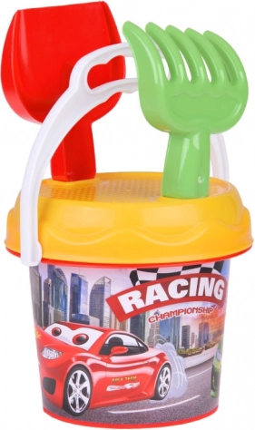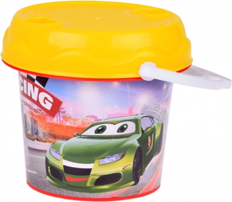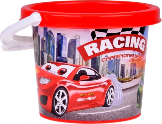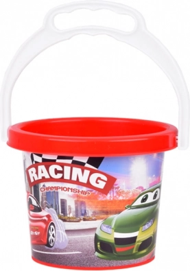 Farverig spand med racermotiv motiverer til leg og er nem at bære takket være det robuste håndtag. Perfekt til både vand og sand.