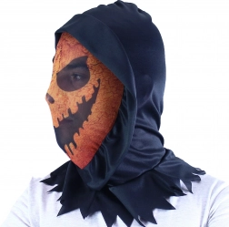 En uhyggelig tekstilmaske i græskarstil med hætte er det ideelle tilbehør til Halloween, fastelavn og temafester. Det lette materiale og den fulde dækning af hovedet sikrer behagelig brug og en markant uhyggelig effekt takket være det orange “jack-o’-lantern”-ansigt med mørke øjenhuler og et truende smil.