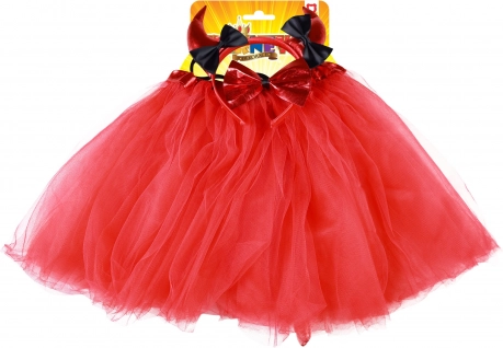 Den fyldige tylskørt i en strålende rød farve giver kostumet en “wow”-effekt, og halen fremhæver det djævelske look.