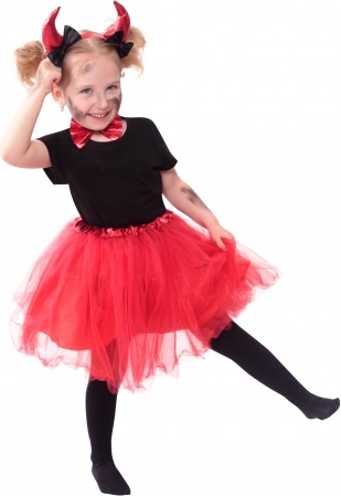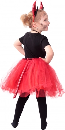 Nederdelen har elastik i taljen for nem påklædning og behagelig brug. Sættet fuldendes af en hårbøjle med horn og en elegant hals-sløjfe, som giver et fuldendt djævelsk look uden behov for ekstra tilbehør.