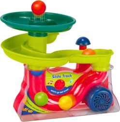 Den interaktive fontæne med rutsjebane er udstyret med en stor knap, som ved tryk aktiverer hele mekanismen. Fontænen skyder fem farvede bolde op i luften og skaber et imponerende show, der fanger barnets opmærksomhed.
