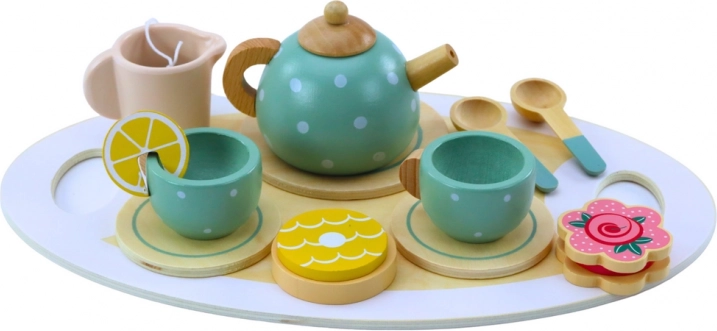 Dette træ- te- og kaffesæt er ideelt til rolleleg med madlavning og servering. Takket være den omhyggelige forarbejdning og det miljøvenlige materiale er det holdbart, behageligt at røre ved og sikkert for børnehænder. Børn vil elske at servere te med kande, kopper og supplere med træfrugt.