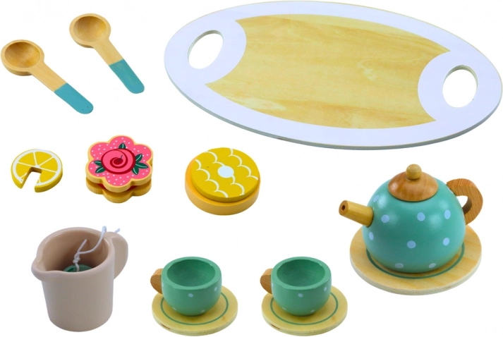 Det søde sæt til små værter giver timevis af kreativ leg. Indeholder tallerkener, kopper, kande, skeer, bakke og træfrugt. Den kvalitetsrige trækonstruktion er holdbar og skånsom mod naturen, egnet fra 3 år. Opfylder CE og standarden EN 71 for sikker børneleg.