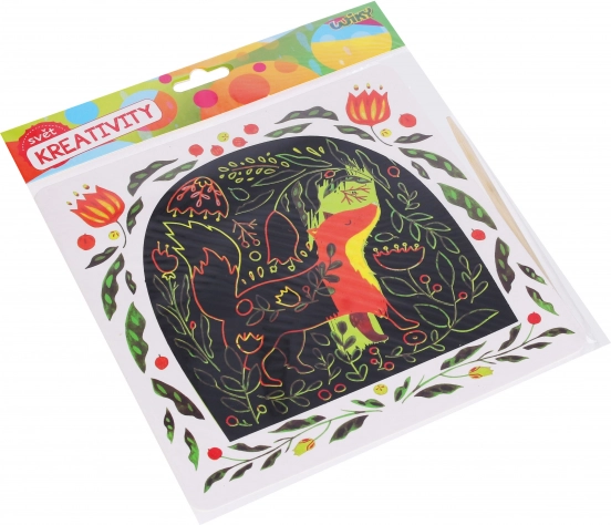 Skrabebillede 20x20 cm med skraber og fire motiver. Ideelt til kreativt udtryk.